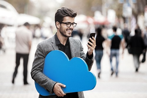 Close up shot of a blue digital screen, a graphic of a cloud with lines connection to different internet based devices
